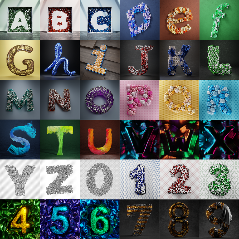 Houdini Apprentice project files of all the letters, numbers and ampersand. Except for 7, that file seems to have gone missing.